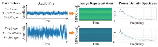 The transformation of raw sound signals begins with segmenting the continuous waveform into short, overlapping frames using a sliding window with predefined frame length and hop size. For each frame, the power spectrum is calculated via the Fast Fourier Transform (FFT), providing a spectral representation of the signal. This spectrum is subsequently processed through a bank of triangular filters distributed according to the Mel scale, which models the nonlinear frequency sensitivity of human auditory perception. This filtering emphasizes perceptually significant frequency components while attenuating less informative regions. Following this, the Discrete Cosine Transform (DCT) is applied to decorrelate the resulting features and reduce dimensionality, resulting in a fixed number of MFCCs per frame. The temporal sequence of these MFCC vectors forms a two-dimensional representation, with rows corresponding to individual cepstral coefficients and columns representing time frames. These MFCC-based spectrograms are then standardized and optionally resized to conform with the input dimensions of AI models, thus enabling efficient learning of discriminative patterns from audio data in a visual domain. Characteristic results of the applied transformation method are displayed in Figure 3. Finally, it is worth noting that even though the Mel scale is conventionally employed in audio feature extraction in several studies, its direct mapping from human auditory perception could potentially not be fully aligned with machine-generated sound data. An alternative approach for analyzing such data, particularly with emphasis on spectral characteristics, involves the examination of the Power Spectral Density (PSD) of the signals. This can be effectively visualized through characteristic diagrams depicting the PSD as a function of frequency, as shown on the right of Figure 3. However, in the present work, the MFCC approach demonstrated robust efficacy in assessing surface quality characteristics of the machined products, proving particularly effective at capturing subtle texture variations and finish irregularities.