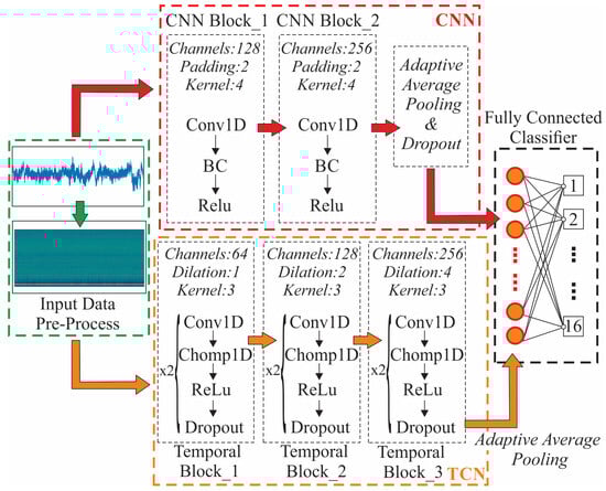 The main objective of the present work is to develop an autonomous system that can receive audio signals from a milling center in real-time and evaluate the surface finish of the manufactured component. In order to approach this behavior, four AI models (CNN, TCN, RF and SVM) were developed to classify audio signals captured during milling operations. The models like CNN and TCN take as input a 2D representation of MFCCs, which encode time–frequency information of the audio signals as described in the previous paragraph. Upon loading, the audio signals are converted to mono and normalized to zero mean and unit variance. Considering the CNN, the upper part of Figure 4 displays the employed network that is comprised of two convolutional layers with ReLU activations and batch normalization to enhance training stability and convergence. The first convolutional layer maps the input MFCC features with 40 coefficients to 128 channels, followed by a second layer that increases this to 256 channels. Both layers use a kernel size of four with padding to preserve temporal dimensions. An adaptive average pooling layer reduces the temporal dimension to a fixed size of one, followed by a dropout layer with rate equal to 0.2 to mitigate overfitting. The final fully connected layer maps the resulting feature representation to 16 output classes corresponding to different experimental configurations. In addition, the training is conducted for 50 epochs using the Adam optimizer with a learning rate of 0.001. Finally, the loss function used is categorical cross-entropy, suitable for multi-class classification.