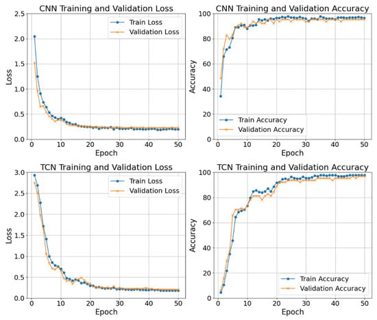 The effectiveness of the CNN and TCN models was also assessed through the use of two essential diagnostic plots, such as the loss versus epochs and the accuracy values versus epochs. The diagrams in Figure 6 provide essential insights into the learning behavior of the models throughout the training process and serve as indicators of generalization capability and convergence dynamics. The loss versus epochs diagrams illustrate how the value of the loss function, specifically the cross-entropy loss used for multi-class classification, evolves across successive training epochs. For both the CNN and TCN models, these plots include two distinct curves representing the loss on the training set and the validation set, respectively. A consistent decline in the training loss indicated that both of the models were progressively minimizing the discrepancy between predicted and true class labels during training. In addition, the validation loss follows a similar decreasing trend, suggesting effective generalization to unseen data. In the case of the CNN model, the training loss exhibited a rapid initial decrease, reflecting the model’s ability to quickly capture spatial features from the MFCC-based input representations. The training loss drops rapidly within the first ten epochs and stabilizes below 0.3 after approximately 20 epochs, suggesting convergence. In addition, the validation loss follows a similar trend, albeit with slightly higher values than the training loss, indicating a moderate generalization gap and the absence of significant overfitting. However, after a certain number of epochs, the validation loss tended to plateau, whereas the TCN model demonstrated a more gradual reduction in training loss, maintaining a marginally more stable and consistently low validation loss throughout the training phase. This behavior underscores the TCN model’s slightly enhanced ability to capture temporal dependencies within the audio signal, along with its increased resilience to overfitting.