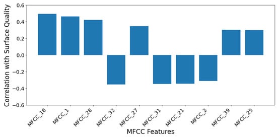 A Pearson correlation plot between individual MFCCs and surface roughness quality could reveal the degree of association between each audio feature and the roughness output, as demonstrated in Figure 7. In particular, the plot displays a diverse range of correlation values, reflecting the varying sensitivities of the most dominant MFCC features to the sound characteristics of the milling procedure. Generally, the strongest positive correlations are with surface roughness, indicating that increases in these spectral features are associated with higher roughness values. In contrast, negative correlation implies an inverse relationship wherein higher values of this coefficient correspond to smoother surfaces. It is worth mentioning that the figure serves to identify which spectral components of the milling audio signals exhibit predominant relationships with surface finish, thereby informing feature selection and model interpretability in the context of audio-based machining quality assessment. Hereupon, the MFCCs could be utilized not only as input features for classification models but also as a means of gaining interpretable, frequency-specific insight into the physical phenomena that could occur during the milling process.