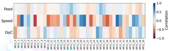 It is relevant to highlight that each MFCC corresponds to a different region of the mel-scaled frequency spectrum, which reflects how sound frequencies are perceived and is particularly suitable for analyzing sound signals from machining operations [32]. Moreover, the correlation analysis revealed strong relationships between specific MFCCs and key milling conditions and outcomes. Notably, each MFCC exhibited distinct correlations with different machining variables, i.e., the spindle rate is strongly correlated with MFCC_1, MFCC_2, MFCC_16, MFCC_21, and MFCC_28; the depth of cut aligns with MFCC_25 and MFCC_32; and finally, the feed rate shows a relationship with MFCC_4 and MFCC_26, as indicated by Figure 8. By identifying which MFCCs are strongly correlated with key milling conditions, it becomes feasible to infer process states or surface quality directly from AE, without the need for physical sensors or interruptions. Hence, in practical terms, these correlations allow the development of quality control systems that can estimate in situ the surface finish quality, taking into account audio signals alone. Integrating such models into CNC systems could potentially enable real-time adjustments of the applied milling parameters based on sound feedback, which can minimize tool damage, improve surface quality and reduce scrap rates. Therefore, mapping the correlations between individual MFCCs, surface roughness, and cutting conditions may enable a more sophisticated interpretation of the relationship between audio features and machining outcomes.