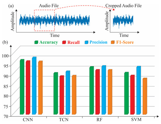 Particularly, the performance of the TCN model degrades significantly, becoming the least effective among the examined classifiers. This decline in performance can be explained by the model’s dependency on longer input sequences to fully leverage its receptive field. With shorter input lengths, the TCN is no longer able to utilize its dilated convolutions effectively, as the sequential patterns become truncated and insufficient for the model to recognize the same long-range dependencies it was trained to detect. Hereupon, the drop in TCN performance on shorter audio samples illustrates a limitation of sequence models that rely on extended context, highlighting the importance of input length compatibility in temporal DL architectures. On the other hand, models like CNNs, which rely more on local feature extraction and less on the temporal extent of the signal, retain enhanced performance under these conditions. Hence, the CNN can still extract spatial patterns from the MFCC representation even in shorter clips, as exhibited in Figure 9b. Similarly, the RF classifier relies heavily on aggregated statistical features computed over the full audio duration. Utilizing shorter signals, these statistical features become less stable and less representative of the underlying audio class, leading to higher variability and weaker decision boundaries across the decision trees. As a result, the ensemble of trees in the RF lacks the discriminative power it exhibited when trained and evaluated on longer, more information-rich signals. In contrast, the kernel-based mapping coupled with the margin maximization principle allowed the SVM classifier to retain a higher degree of generalization under conditions where the feature set becomes less descriptive. Therefore, although both RF and SVM classifiers underperform on short-duration audio inputs compared to their performance on the original full-length data, the SVM’s performance remains comparatively more stable.