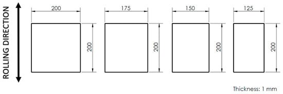 In this study, the main variable was DB geometry, as the blank holder force was fixed in 1157 kN. Test specimens obtained from the sheet metal were limited to only four sample dimensions, all 200 mm in length and with widths of 125, 150, 175 and 200 mm, as shown in Figure 1. Only these geometries were used, since these are the specimens that produce stretching deformations in the sheet metal, a condition in which the effect of blank holder force and DB are predominant around the punch. The narrower specimens, whose sides do not have direct contact with the blank press and, therefore, produce deformations by drawing, were disregarded, since they do not allow for a more precise evaluation of the effect of the force of the blank press and the DB geometry. It should be noted that, in practical operations, the DB acts fully on the entire contour of the part.
