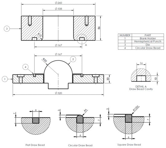 After the material was cut, test specimens were cleaned and printed with a 5 mm diameter circle mesh using the silkscreen method. At this stage, the paint was prepared using a mixture of 90% epoxy paint and 10% nitric acid. This preparation ensured a good finish and the good adhesion of the paint to the specimen’s surface. Tests were performed three times for each condition. The profile and dimension of three DB geometries P (plane or flat), C (circular), and Q (square). The Nakazima test tool proposed by Oliveira et al. [] is presented in Figure 2 and was composed of die, punch, blank holder, and an interchangeable DB ring. The tool was installed in a hydraulic press, controlled using software, setting the BHF in 1157 kN and using 90 mm/min as punch speed.