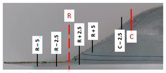 At point R − 2.5 for each sample, the hardness variation was (a) 17.8 HV for flat, (b) 6.7 HV for circular, and (c) 5.4 HV for square geometries. This variation refers to the difference in thickness measurements of 0.1 mm, 0.5 mm, and 0.9 mm from the upper surface of the sheet. The greatest variation was registered for flat geometry. For the circular and square geometries, the variation was closer to each other, being smaller in the square; however, the average hardness at this point was higher, compared to the circular one. At point R from each sample, the hardness variation was (a) 29.7 HV for flat, (b) 22.5 HV for circular, and (c) 20.6 HV for square geometries. Such hardness variation is consistent with FLC and directly impacts material hardening. The variation in hardness between points R − 2.5 and R of each sample, considering the 0.9 mm elevation from the upper surface of the sheet, showed an increase in hardness of 25.4 HV for the flat profile, an increase of 10 HV for the circular one, and an increase of 9.3 HV for the square geometry.