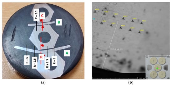 Inlays for nanoindentation and EBSD analysis (a) and indentation arrangement for each point (b).