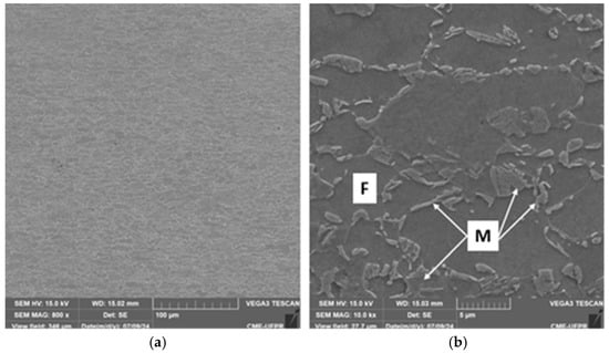 The microstructure of DP600 steel as received, captured using scanning electron microscopy, is shown in Figure 5, with magnifications of 800 and 10,000 times. The figure indicates that the microstructure consists of ferrite (dark gray) and martensite (light gray), as referenced by Raabe [], Wang and Wei [], and Saai et al. []. Martensite is distributed mainly along the ferrite grain boundaries and several small islands of martensite dispersed in the matrix.