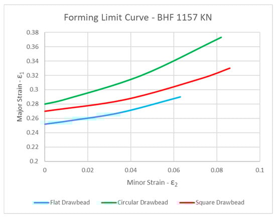 According to the limit forming curves presented, the best performance with the circular DB and the worst performance with the flat one are evident for both sheet press forces used. This result is very close to the results presented by Oliveira et al. [], who performed similar tests for DP780 steel.