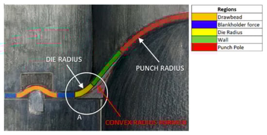The blue regions represent the points where the blank holder acts directly on the material blank. The orange region represents the DB acting area, deforming a metal blank, still on the flange. The yellow region at the end of the flange represents the folded area of the sheet on die radius, where the sheet metal is flowing into the tool. At this moment, the material is subjected to the Bauschinger effect, also, and the sheet metal is counterclockwise bent (indicated by Figure 8). This condition was denominated, similar to “convex forming” of the blank. Studies from Gui et al. [], Kim and Park [], and David et al. [] provide insights about this behavior, highlighting its importance to the material’s performance when submitted to cyclic loads.