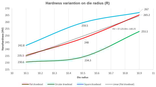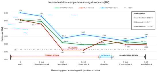 Based on Oliver–Pharr [] method, nanoindentation measurements were performed in different blank regions, as previously presented in Table 2. The deformations caused in each of them are directly related to the hardening of the material during stamping. Nanoindentation results are expressed in [HV], and can be summarized in Figure 9, for different DB geometries.