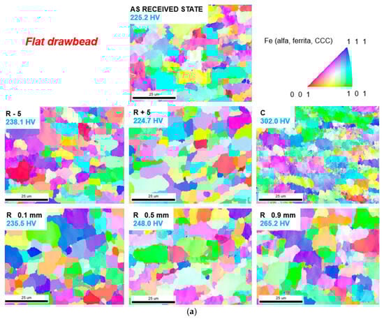 The maps and images obtained using EBSD carried out on each sample are presented, depending on the DB type, as presented in Table 1. The figures are presented in “blocks”, which contain seven images each. One image refers to the as-received state for a comparative basis. The other six images refer to each of the points analyzed. Above each image, there is a table that describes the analyzed point and the average hardness value found. In Figure 10 is presented the inverse pole figures for each of the three DB types: (a) flat, (b) circular, and (c) square.