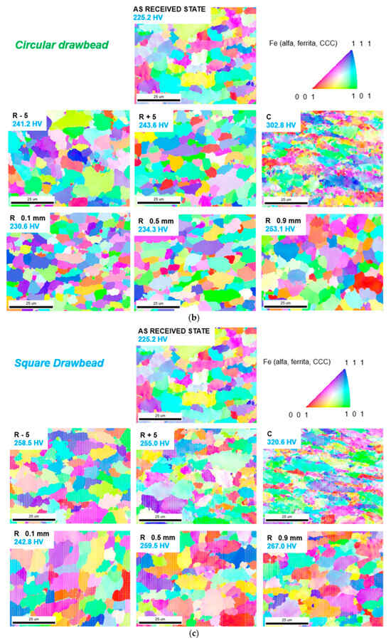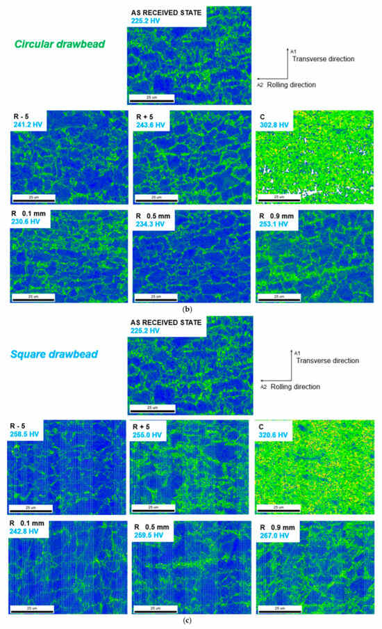 The deformation maps or KAM are shown in Figure 11 (a) for the flat, (b) circular, and (c) square geometries. It is possible to notice a change in the microstructure where the quality worsens with the increase in deformation, which is expected due to the increase in disorientation due to the intense movement of the dislocations. It is possible to observe that, at point R (die radius), the deformation levels increased due to the increase in the dimension that represents the distance in relation to the neutral axis of the sheet, considering that the point with 10.1 mm is closer to R and the point with 10.9 mm is closer to the punch pole, subject to tensile efforts.