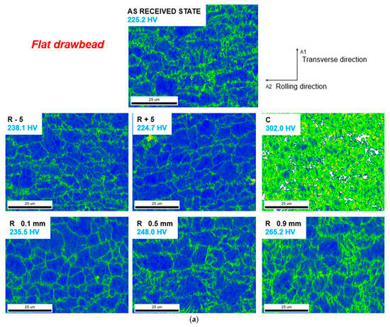As previously mentioned, the point of greatest incidence of such a phenomenon occurs at the die radius, where the highest hardness value was found with square DB (256.4 HV) and the lowest hardness value with the circular one (239.3 HV). The flat DB presented the lowest hardness in the flange region because it does not have the “tooth” that causes the initial deformation, but it had a considerable increase in hardness along the die radius (249.6 HV), with the subsequent formation of a “dead zone” at the beginning of the stamped region, as it allows for a more accentuated sheet flow. The increase in hardness at the die radius, followed by the formation of a “dead zone”, caused a greater variation in hardness, precisely at the entrance of the stamped region, negatively affecting the sheet stampability, which was evidenced once again by the FLC.