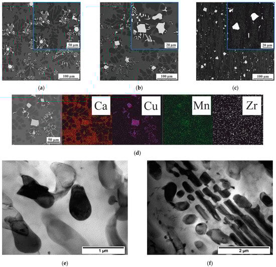 (a–d) SEM and (e,f) TEM microstructure of the experimental alloys: (a) Al5Ca3Cu1.5Mn, (b–f) Al5Ca3Cu1.5Mn0.4Zr. (a,b,d–f) cast, (c) wrought state, and (d) elemental mapping obtained from the selected area.