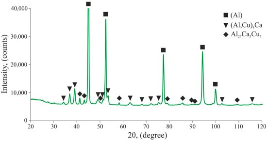 One of the promising alloying systems for further study is Al–Ca–Cu. The new Al–Ca–Cu system is preferable for the design of aluminum matrix composites with very high contents of insoluble intermetallics, due to several quasi-binary eutectic phase transformations described earlier []. The alloy compositions close to the eutectic point (5.6 Ca, 4.5 Cu) have elevated contents of the (Al, Cu)4Ca and Al27Ca3Cu7 intermetallic phases in their structure and can be considered promising as a basis for the additive manufacturing of new materials. The above composition ensures the formation of a ~20% second-phase volume fraction. For comparison, the formation of a heterogeneous structure with a similar second-phase volume fraction in the Al–Ce–Cu alloys can be achieved at ~12% Cu and ~7% Ce. Thus, the new alloys offer a significant advantage and are economically profitable and lightweight.