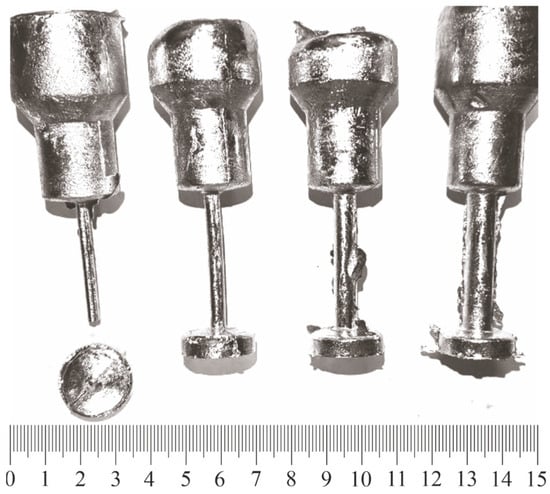 Qualitative assessment of the hot tearing tendency (HTT) was carried out with a pencil probe []. HTT is defined as the maximum diameter of the cylindrical portion of the sample that still does not reveal any cracks. The higher the HTT, the worse the hot cracking performance of the test aluminum alloy.