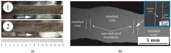 Laser remelting of thin-sheet products was carried out to further study the effect of process conditions typical of AM technologies on the structure and properties of the alloys. The appearance of the obtained 1 mm sheet samples with laser remelting field is presented in Figure 4a. SEM microstructure of track transverse view showing the possible zones formed along the molten pool and tracks quality is presented in Figure 4b. The laser treatment mode with P = 1400 W and V = 20 mm/s allowed the obtainment of a high-quality (crack-free and minimum number of pores) laser remelting field.