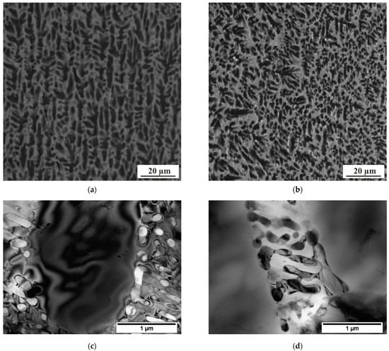 Scanning electron microscopy (SEM, TESCAN VEGA 3, Brno, Czech Republic), with energy-dispersive X-ray spectroscopy (EDS, Oxford Instruments plc, Abingdon, UK), and transmission electron microscopy (TEM, JEM−2100, Tokyo, Japan) were employed to examine the structure and elemental compositions of the alloys. The specimens were prepared by mechanical and electrolytic polishing. The thin foils for TEM were prepared by ion thinning with a Struers device (Struers, Copenhagen, Denmark) and studied at 200 kV.