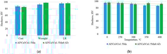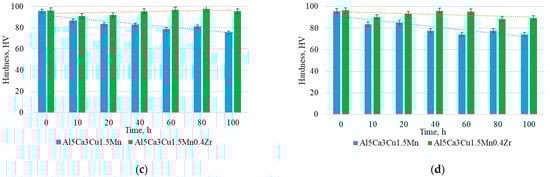 Annealing at 400 °C for 100 h led to the same result for the base Al5Ca3Cu1.5Mn alloy (Figure 6d). The alloy exhibited a gradual decrease in the hardness to 74 HV. However, the hardness of the Al5Ca3Cu1.5Mn0.4Zr alloy during exposure for up to 100 h demonstrated high thermal stability toward softening. The minimum hardness of 89 HV was reached after 100 h of exposure.