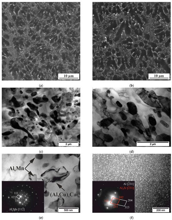 (a,b) SEM and (c–f) TEM images of laser remelting field structure for melting zone after annealing at 400 °C for 100 h: (a,c,e) Al5Ca3Cu1.5Mn and (b,d,f) Al5Ca3Cu1.5Mn0.4Zr.