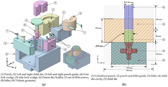 (a) NSF T-Blank Forging Assembly and (b) Base case configuration of the billet, punch, punch guide, and child dies setup in Forge NxT.