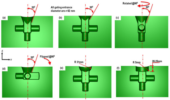(a–f) Comparison of base case configuration and five other design variations. (a) Base case (b) Draft angle modified (c) Rotated geometry (d) Flipped geometry (e) Curvilinear gating (f) Cylindrical gating. The red arrows show the draft angles and the rotation of the part in the dies.