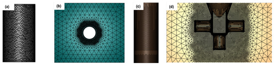 Mesh configurations: (a) billet, (b) punch guide, (c) punch, (d) child die.