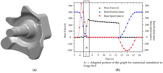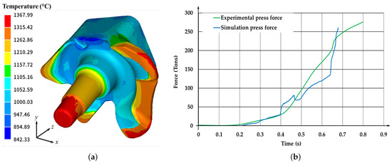 The reliability of the numerical model was assessed by comparing simulation results with experimental data from Plata et al. (2018) [23], which involved the near-solidus forging of an automotive spindle shown in Figure 4a.