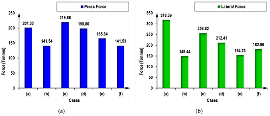 The results of the finite element simulations for the different die design variant cases (a–f) presented in Table 3 are summarized in terms of maximum press force and peak lateral force acting on the child dies. These force values were extracted at the moment of complete cavity filling for each case.