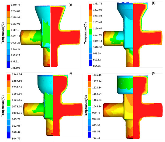 Temperature distribution profiles for selected cases (a,b,e,f). (a) Base case 20° draft angle (b) 30° Draft angle (e) Curvilinear gating (f) Cylindrical gating.