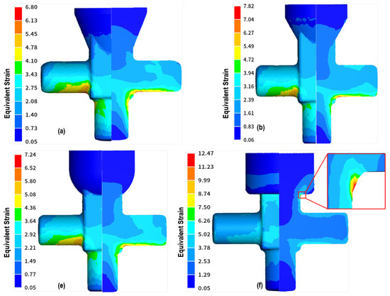 Equivalent strain profile of the selected cases (a,b,e,f). (a) Base case 20° draft angle (b) 30° Draft angle (e) Curvilinear gating (f) Cylindrical gating.
