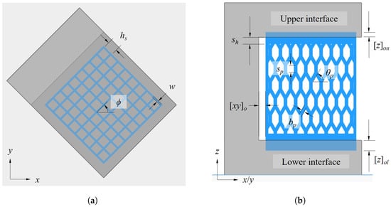 In this study, single-walled block type support structures with perforation were used, as shown in Figure 1, and the nominal geometry was kept constant. In Figure 1a, it is possible to see a top perspective ( plane) from support structure type implemented in this work. It shows the mesh grid formed by the parallel scanning lines, each one of them separated by a distance , and the rotation angle , around the z direction. Still on the image, w is the scanning line width. In single-walled structures, it depends only on the processing parameters [24,27,28]. In Figure 1b, a front or side view is displayed ( or plane). It highlights the angle of the perforation , the thickness of the perforation elements , the height of the perforation elements and the distance between the perforated region and the solid region , which can be the interface between support and substrate or support and part. Furthermore, the compensation offset between the support structure and part contour is shown, as well as the re-entrant offset of the support in the part, which may be different for the upper () and lower interfaces (). The software used for designing the support structure was Magics, version 26.02, from Materialise.