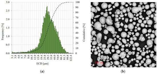 Feedstock characteristics: (a) Particle size distribution of the powder sample based on the equivalent circular diameter (ECD), given in micrometers. The green bars represent the frequency distribution, while the black dashed line indicates the cumulative distribution, both given in percentage. (b) Scanning electron micrograph of stainless steel 316L powder.