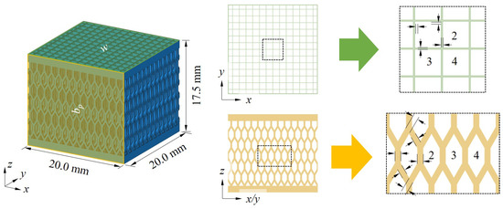 The samples consisted of single-walled block type support structures with delimited size of 20.0 mm in length, 20.0 mm in width and 17.5 mm in height—a size sufficiently representative when compared to the samples used in Lindecke [22] and Leary [23]. Figure 4 shows an image of the sample, as well as how the dimensions w and were taken. Regarding , four adjacent horizontal beam thickness perforations and all sides were measured, while for w, four grid elements were chosen for the measurements and just the upper side was used. The average of the measurements was calculated as the actual dimensions of the structure. The standard deviation was also calculated.