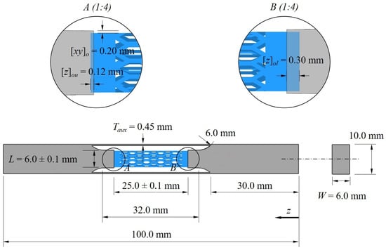 The objective of the second stage was to characterize the maximum load resisted by the support structures with the qualified combinations of P and v from the first stage. The strength specimens were designed and tested based on the standard ASTM-E8/E8M [31], as depicted in Figure 5. The specimen design was adapted with auxiliary struts with thickness aiming to protect the support structures from residual stresses and enhance heat dissipation during L-PBF processing, since it was the object of study [22,26,32]. After the fabrication was concluded, the struts were cut via WEDM. Besides the design description, a of 0.12 mm, a of 0.30 mm, a of 0.20 mm and of 0.45 mm were implemented. The tensile strength tests were conducted using a universal testing machine from Instron, model 5988, with a cell load of 4 kN with a minimum resolution of 0.01 N. In addition, a preload of 50 N and a displacement rate of 0.025 mm/s was used.