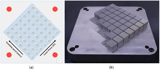 The processing parameter exploration build job consisted of a total of 292 layers and was completed in 4 h and 5 min. Figure 6 shows the build model planned and the manufactured samples in Figure 6a and Figure 6b, respectively. After the completion of the manufacturing process, the powder was removed, and the substrate was disassembled from the build platform. With the substrate out of the machine, it was already evident that some of the samples were not successfully processed. Out of the 49 samples, those with identification numbers 08, 15, 16, 22, 23, 29 to 31, 36 to 38, and 43 to 45 were not completed successfully.