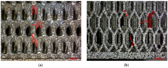 Regarding the sample’s integrity, Figure 9 shows, with a 1.6× magnification, the influence of the upper and lower boundaries of on the lateral sizing of the beam elements. Samples 07 and 46 exhibit the highest and lowest values of , respectively, and the contrast between the two samples is notorious. As can be seen in Figure 9a, sample 07 exhibits some excessively large elements and areas where material appears to have flowed, resembling the dross effect previously described by Calignano [20] and Lindecke [22]. On the other hand, Figure 9b shows sample 46, which displays a series of discontinuities within the structure. The dross effect was also identified in samples 04 to 07 and 14, which corresponded to the highest values of . Meanwhile, discontinuities were observed in samples 24, 32, 39 to 41, and within the range of 46 to 49, which corresponded to the lowest values of .