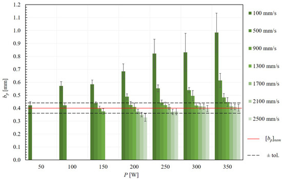 Figure 10 presents the mean and standard deviation of the measured values for all manufactured samples. The solid line indicates the nominal value (0.400 mm), while the dashed lines represent the maximum (0.440 mm) and minimum (0.360 mm) allowable values arbitrated in this study. Measured values ranged from 0.329 mm to 0.984 mm, and the behavior reaffirms the influence of the processing parameters on the geometric aspects of single-walled block type support structures. For a constant v, increasing P yields a near-linear response in ; conversely, for a constant P, increasing v reduces following a power-law trend. Another notable observation is the standard deviation, which increases as the measured increases as well and deviates from the nominal dimension. This may be related to measurement difficulties caused by the dross effect, as shown in Figure 9. In total, 19 different processing parameter combinations were according to the specified tolerance.