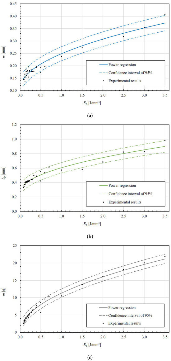 Adopting the hypotheses of Großmann [28] exposed by Equation (3) and using the proposed model from Equation (4), a power regression method based on , as shown in Figure 11, can be implemented regarding each one of the results, where w relates to Figure 11a, to Figure 11b and m to Figure 11c. All results are shown with a confidence interval of 95% in terms of , calculated by Equation (2). The black spots represent the measured results. Additionally, Equations (9)–(11) describe the power regression models , and for each studied factor w, and m, necessarily in that order. If the relation is true, then is also true, since the diameter spot and the layer thickness t were fixed constant during the whole experiment, as Equation (1) suggests. The correlations are written as follows