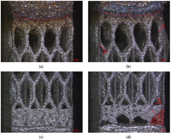 Discontinuities in tensile specimen 33 are clearly visible on both interfaces, as well as warping on the upper interface of both specimens, evidenced by the red marks. It was observed that all specimens exhibited a different coloration near the upper interface region between the support structure and the solid part, which may indicate overheating. This might be related to a scenario involving an abrupt increase in temperature due to heat input and difficulty in heat dissipation. When the lower interface is being processed, the laser scan area—and consequently the heat generated—is significantly smaller compared to the upper interface. Additionally, at the lower interface, heat is dissipated by conduction much more easily than at the upper interface due to the different areas through which it flows [22].
