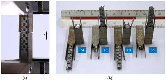 Figure 14 depicts the specimen with its testing setup and some preliminary evaluation of the tensile testing result. Before testing, all auxiliary struts were cut via WEDM, as depicted in Figure 14a. On average, specimens with the lowest values fractured at the lower interface, whereas the others failed at the intermediate region, mostly close to the upper interface. The transition in the fracture location occurs between 0.176 J/mm and 0.206 J/mm, evidenced by samples 34, 26, 09, and 35, as shown in Figure 14b.