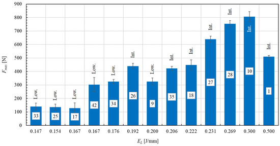 Figure 15 shows the average maximum and the standard deviation load resistance () recorded by the load cell for the replicas corresponding to each specimen, organized in ascending order of . It also indicates the predominant fracture location for each specimen, where the abbreviation “int.” refers to failure at the intermediate region, and “low.” to failure at the lower interface region.