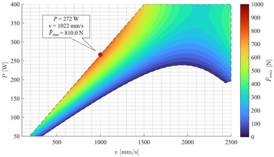 It should be noted that the minimum limit imposed by Equation (13) only constrains results at the upper boundary on the graph, and a small portion at the lower boundary. For this model, the optimal prediction was given by the parameter set P = 272 W and v = 1022 mm/s ( = 0.266 J/mm), yielding a value of = 810.0 N. This result is slightly higher than that obtained in experiments for specimen 10, but still within the standard deviation range ( = 805.4 ± 37.9 N). The developed method for finding optimal P and v parameters for single-walled block type support structures has not been validated. However, this methodology enables establishing guidelines aligned with the designer’s objectives. For instance, a similar analysis could be employed when optimizing for either productivity maximization or material loss minimization. It should be emphasized that these results are strictly valid only for the studied layer thickness t = 0.060 mm, requiring recalibration for other layer thicknesses. For higher layer thicknesses, we expect less resolution, dimensional accuracy and tensile resistance, but more elongation and an increase in productivity [29].