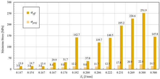Maximum stress results based on projected tensile strength and maximum effective tensile strength according to the linear energy density .