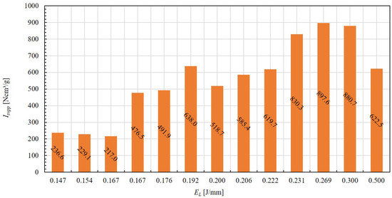 It is worth highlighting some inconsistencies in relation to the expected trend. Notably, specimen 42 withstood twice the load of specimen 17, despite both corresponding to the same . The difference between the two lies in the combination of P and v: specimen 42 was processed with P = 350 W and v = 2100 mm/s, whereas specimen 17 was processed with P = 150 W and v = 900 mm/s. In addition to that, specimen 01 (P = 50 W, v = 100 mm/s, = 0.200 J/mm), which corresponded to the highest , did not necessarily match with the highest . This result not only reinforces the hypothesis that slower scanning speeds tend to enhance heat dissipation, but also may suggest that higher power levels for the same tend to promote better consolidation at the lower interface between the support and the solid part.
