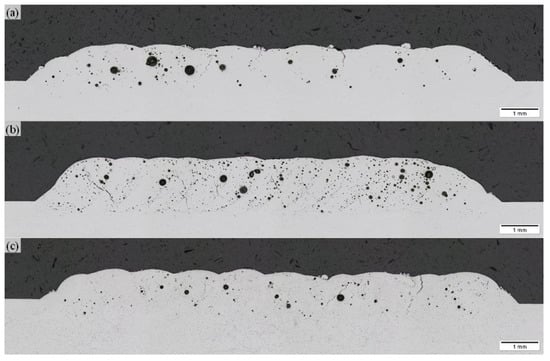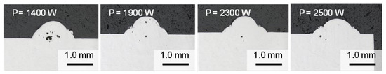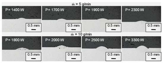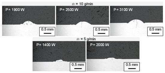 - The EHLA deposition of Al6061 presents microcracks already in the single-track deposition. No defects were registered in our experiments with AlSi10Mg powder on the Al6061 substrate. Increased beam powers between P = 2600–2900 W result in crack- and pore-free single beads and single layers.