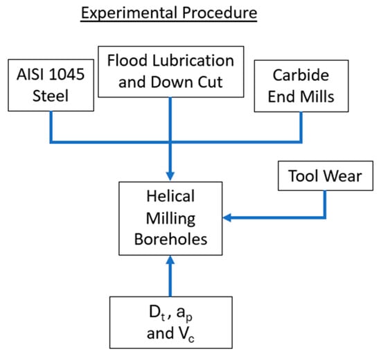 For determining F, corresponding to Vf, Equation (2) was used to calculate Vfp, which represents the tool feed speed at its periphery. The variables fz and z are used in this equation, where the fz used was 0.1 mm/tooth, representing the feed per tooth, and z was the number of tool teeth. To determine F or Vf, Equation (3) was used, where Dh is the helix diameter [mm], which is the diameter of the tool’s circular trajectory. Table 2 shows the parameters used in each test. Figure 1 presents a summary of the experimental procedure.