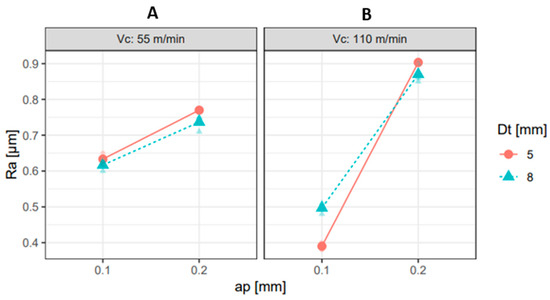 Interaction plots for Ra, for Vc = 55 m/min (A) and for Vc = 110 m/min (B), highlighting the combined effects of Dt and ap.