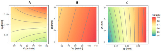 Contour plots showing the combined effects of Vc, ap, and Dt on Ra, Vc, and ap interaction (A); Vc and Dt interaction (B); and ap and Dt interaction (C).