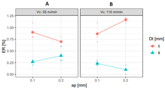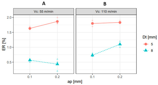 Regarding the interaction plots concerning upper and lower nominal diameter measurements, it was observed that higher Vc values resulted in increased ER (Figure 4 and Figure 5). This might be attributed to chatter during milling, as previously reported in the literature [20], but will be left for analysis in a future study. Similarly, higher ap values led to greater geometric errors at the upper and lower end of the hole (Figure 4B and Figure 5B).